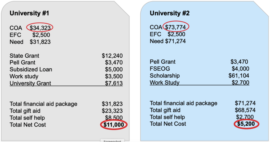 Look at these two different financial aid packages. The net prices at the bottom are the financial costs you and your family are responsible for.